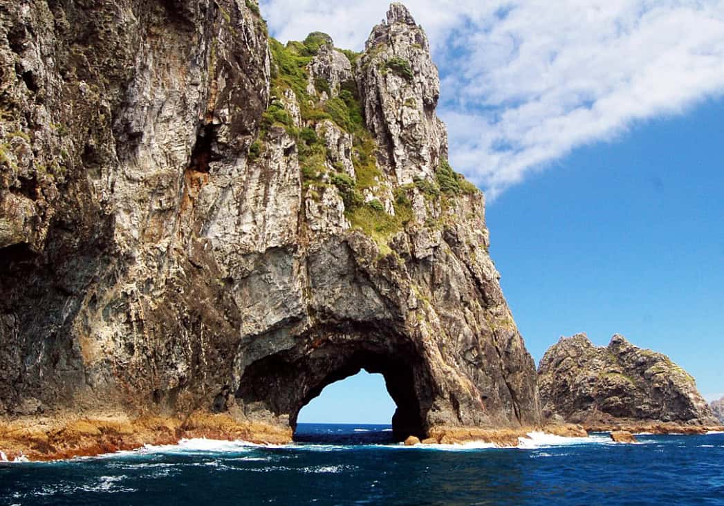 The highlight of the trip is the journey out to Motukōkako, also known as Piercy Island, located at the tip of Cape Brett. Here, nature has carved a dramatic sea arch straight through the rock, forming the famous “Hole in the Rock.” Standing on deck as the boat approaches, you’ll feel the scale of the formation towering above you. If sea conditions are calm enough, the skipper will guide the vessel directly through the narrow opening—an exhilarating moment that draws cheers and camera flashes from passengers. Even if conditions don’t allow passage, the close-up view of the arch is still deeply impressive.