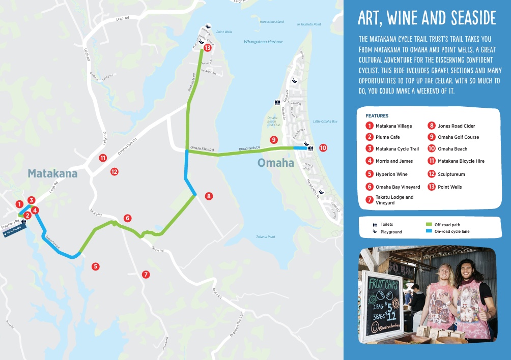 Just an hour north of Auckland, the Matakana Cycle Trail is one of the region’s most rewarding rides. Running from Matakana Village through to Omaha, with a side trip to Point Wells, the trail winds through a landscape that feels a world away from the city. The route is a mix of off-road shared paths, cycle lanes, and quiet roads with some gravel sections, making it best suited to confident riders. There are a couple of steep climbs along the way, but plenty of opportunities to refuel at cafés, wineries, and fresh produce roadside stalls — so you’ll never go hungry or thirsty for long. Start your journey in Matakana Village, where you can catch a film at the local cinema, grab lunch, or stock up at the bustling Saturday farmers’ market. As you ride, the trail meanders through charming farmland, lush bush, and quiet communities, with eight ceramic sculptural markers adding an artistic touch along the way. Finish up with a swim at Omaha’s white sand beach, or push on to the quiet shores of Point Wells. It’s easy to make a full day — or even a weekend — out of this ride. Bikes are available to hire locally, so all you really need to bring is a sense of adventure.